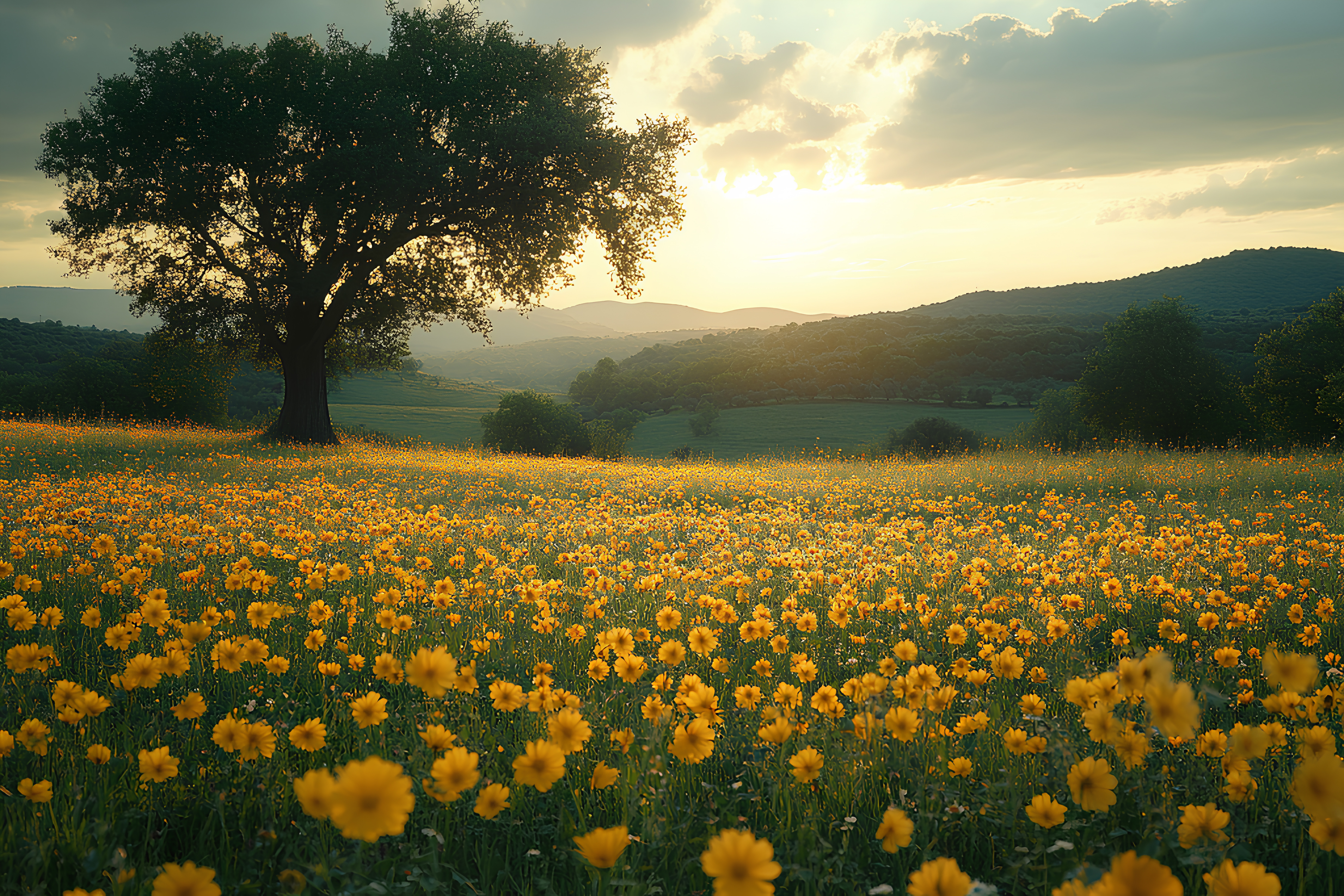 Step into a peaceful field where wildflowers bloom under soft daylight, inviting serenity and a gentle rural charm. This AI-generated countryside photography poster offers a timeless view that soothes the soul and complements any space with organic beauty.
